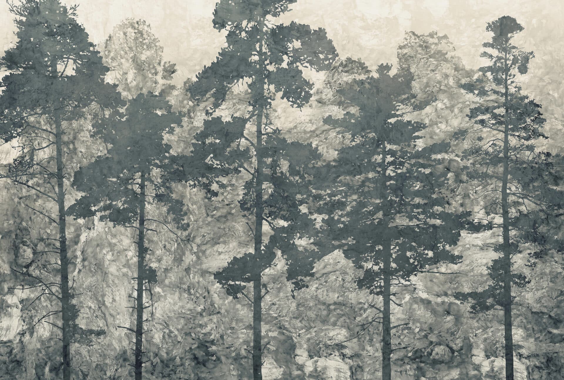 Zarte Aquarellverläufe treffen auf präzise gezeichnete Stämme, die Schatten und Tiefe verleihen. Die Farbwelt aus gedämpften Grüntönen und Graunuancen evoziert Ruhe und Einkehr. Jeder Baum wirkt wie ein stiller Zeuge vergangener Jahre – schweigend, aber bedeutungsvoll.