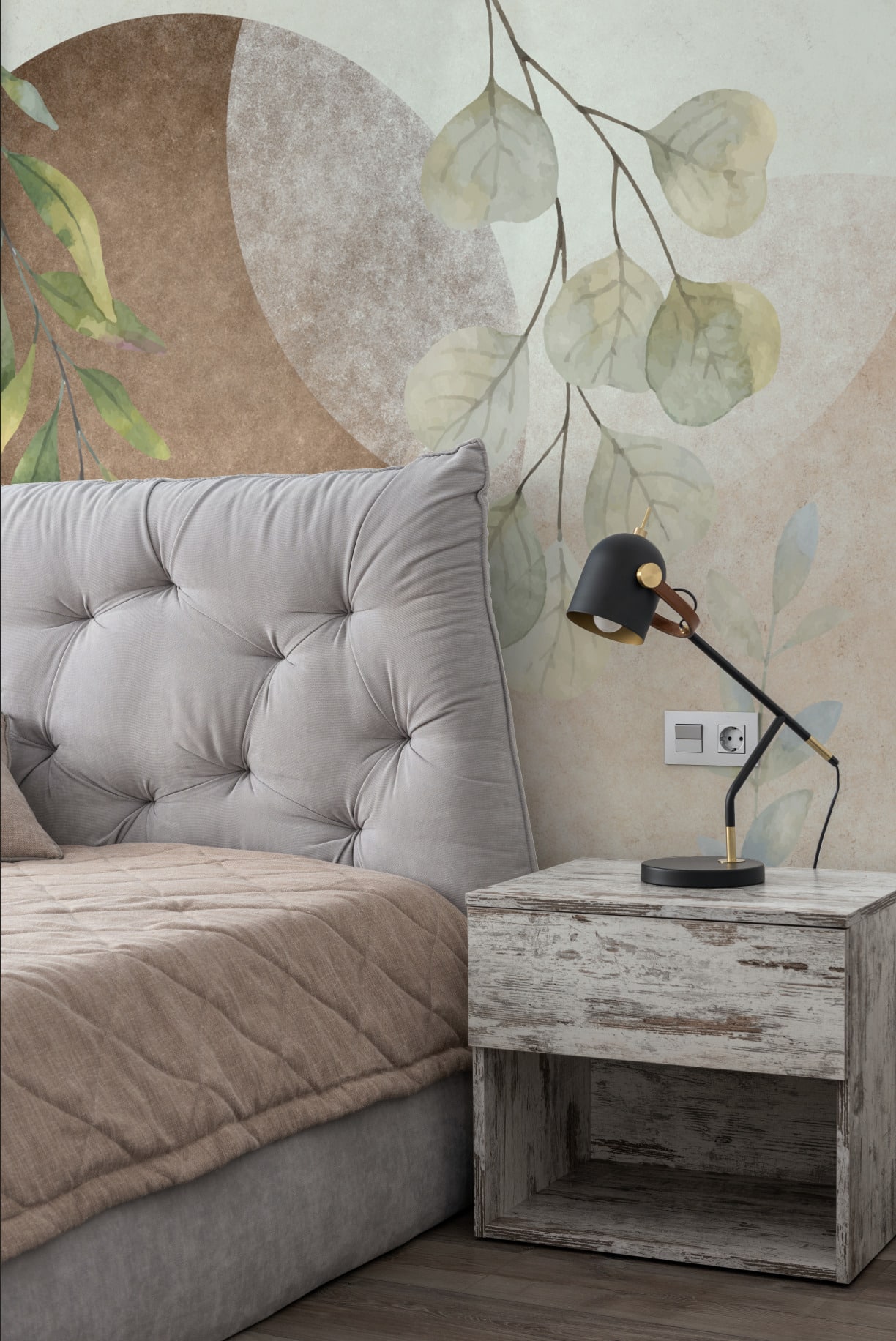Der Hintergrund ist reich texturiert, mit einem Hauch Patina, der Tiefe und Charakter verleiht. Die Farben changieren zwischen smaragdgrün, petrol, gold und warmem Beige – ein Gesamtbild, das luxuriös und natürlich zugleich wirkt.