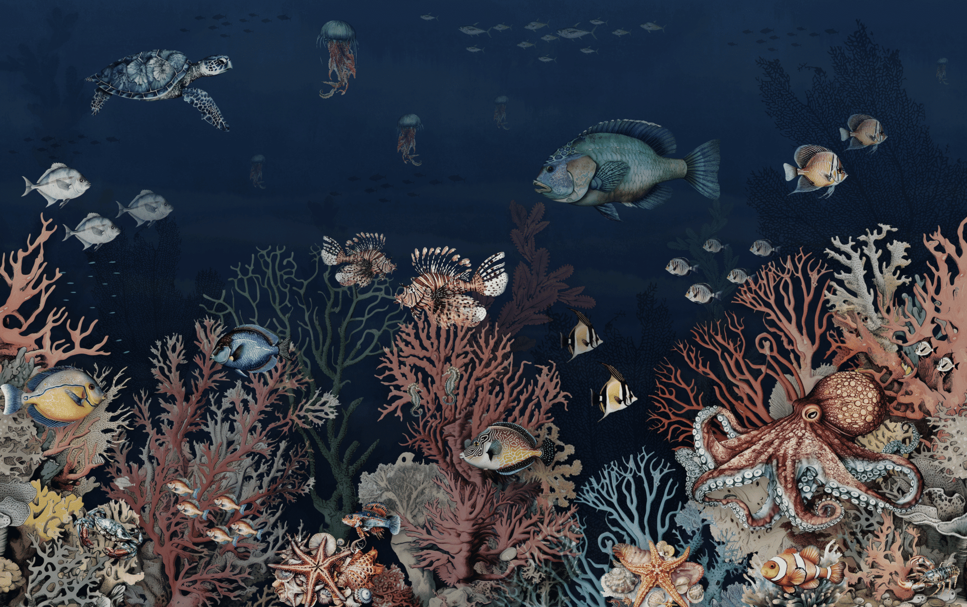 Die Dunkelheit des Meeresbodens bildet die Bühne für ein Spektakel aus Farben und Formen: das tiefe Mitternachtsblau kontrastiert mit den detailverliebten Illustrationen der Meeresbewohner. Alles wirkt wie mit Licht getupft – ein Bild, das Ruhe schenkt und zugleich zum Entdecken einlädt.
