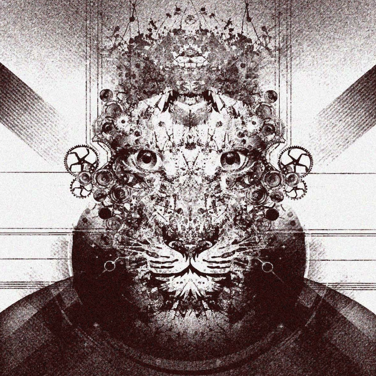 Ein majestätischer Tigerkopf, konstruiert aus feinen Linien, Zahnrädern und symmetrischen Mustern, blickt den Betrachter direkt an. „Tiger“ verbindet Tierwelt und Technik in einer surrealen Synthese: Natur als Maschine, Wildnis als Struktur. Die anmutige Form des Raubtiers wird in Schwarz-Weiß abstrahiert – wie ein Röntgenbild voller Geheimnisse.