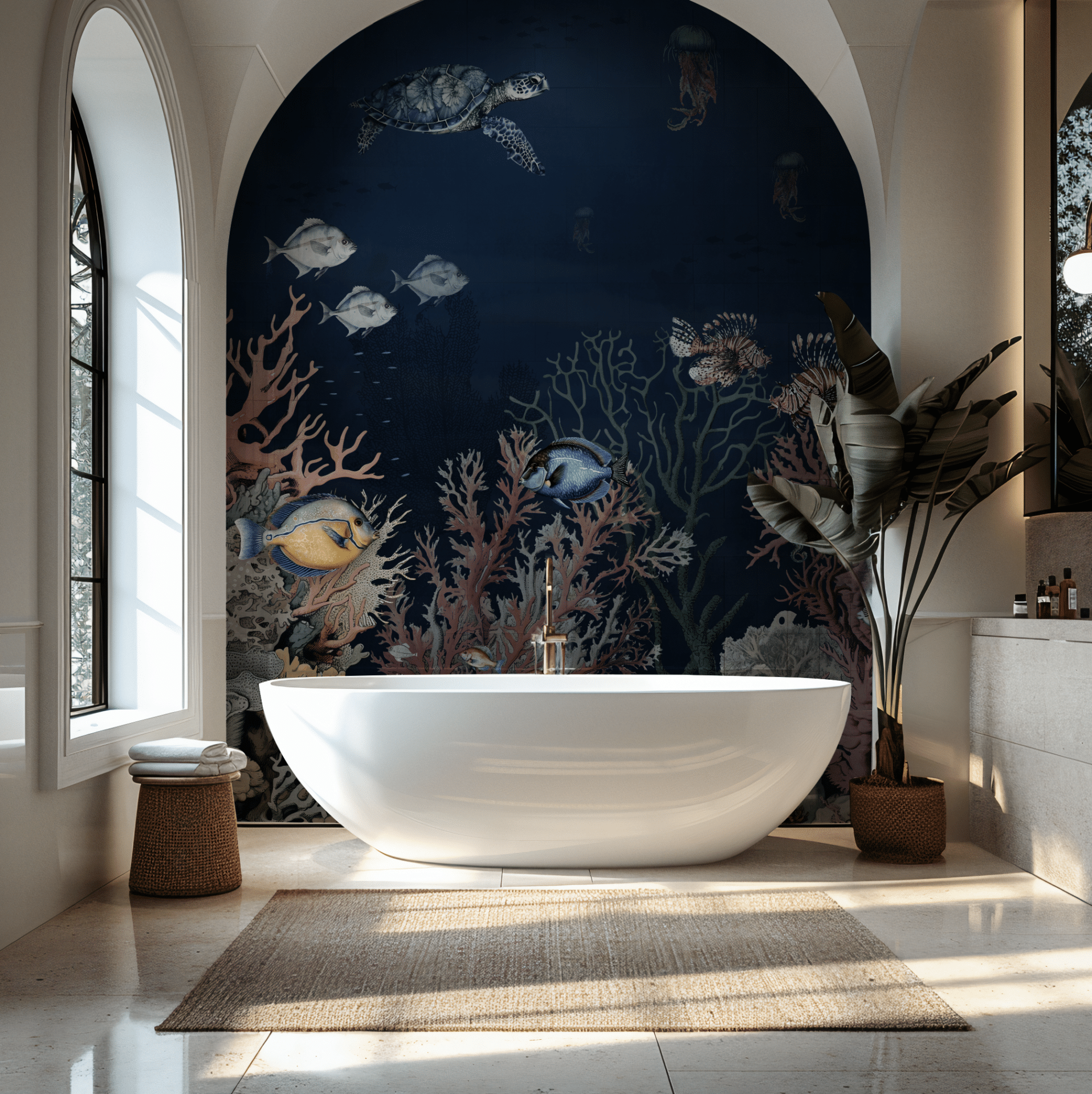 Gedruckt auf hochwertiger Leinwandtapete von Syndikat4, mit fühlbarer Oberfläche und handgearbeitetem Charakter. Ideal für lichtdurchflutete Wohnräume, moderne Dschungel-Küchen, Flure mit Fernweh oder kreative Oasen in Büros und Hotels.