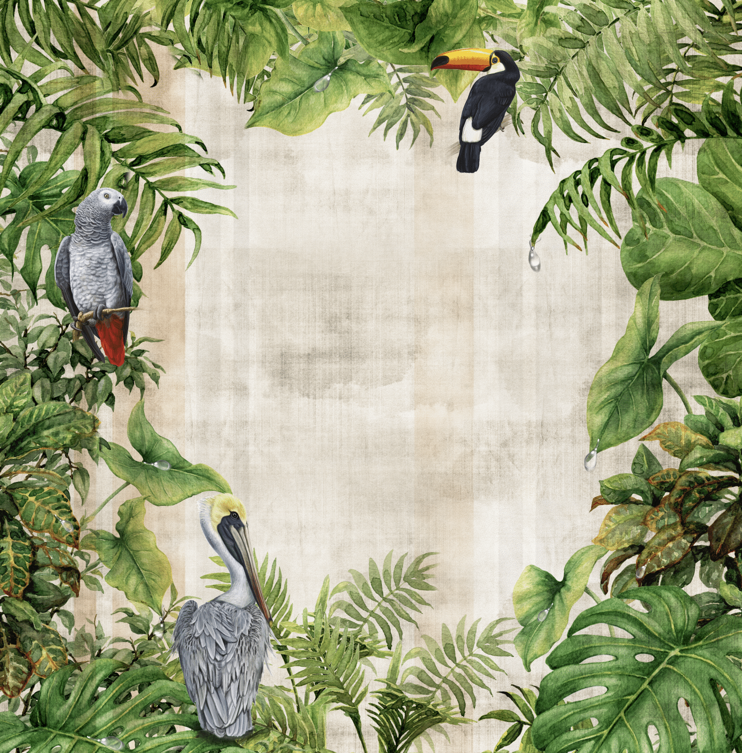 Tropical ist wie ein Blick nach draußen – in ein grünes Paradies voller Leben und Leichtigkeit. Üppige Monstera-, Farn- und Palmenblätter umrahmen eine offene Fläche wie ein natürlicher Vorhang. Dazwischen ruhen Tukan, Pelikan und Graupapagei – aufmerksam, lebendig und mit einem Hauch Exotik. Das Motiv ist klar komponiert, aber nicht starr – es lässt Luft, Raum, Fantasie.