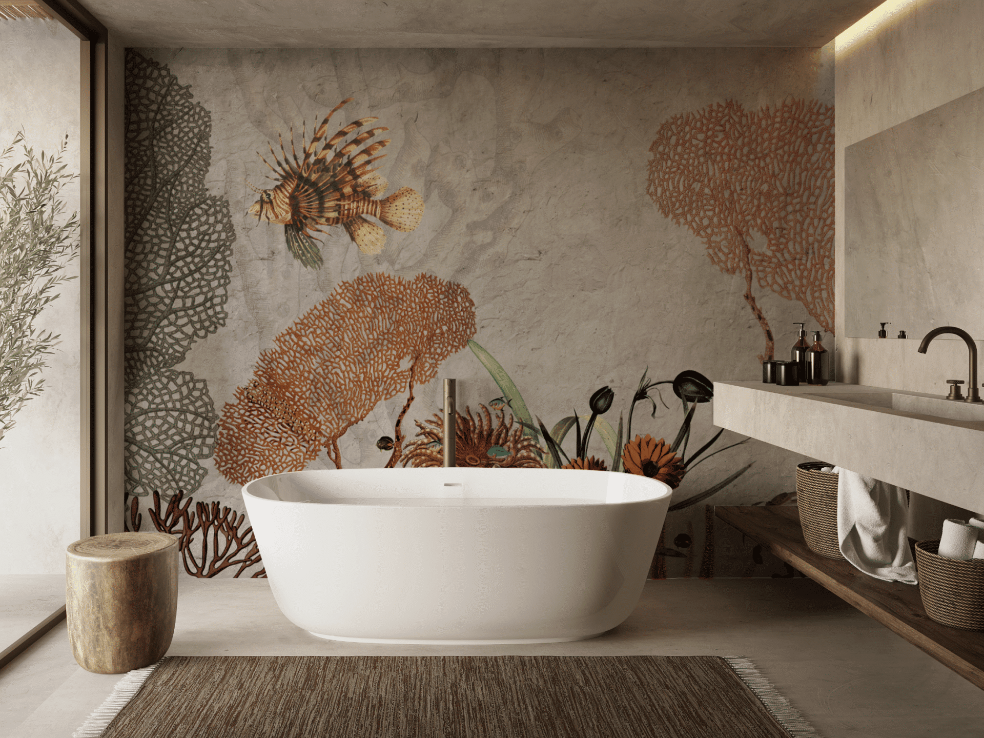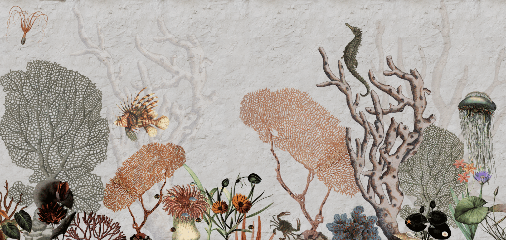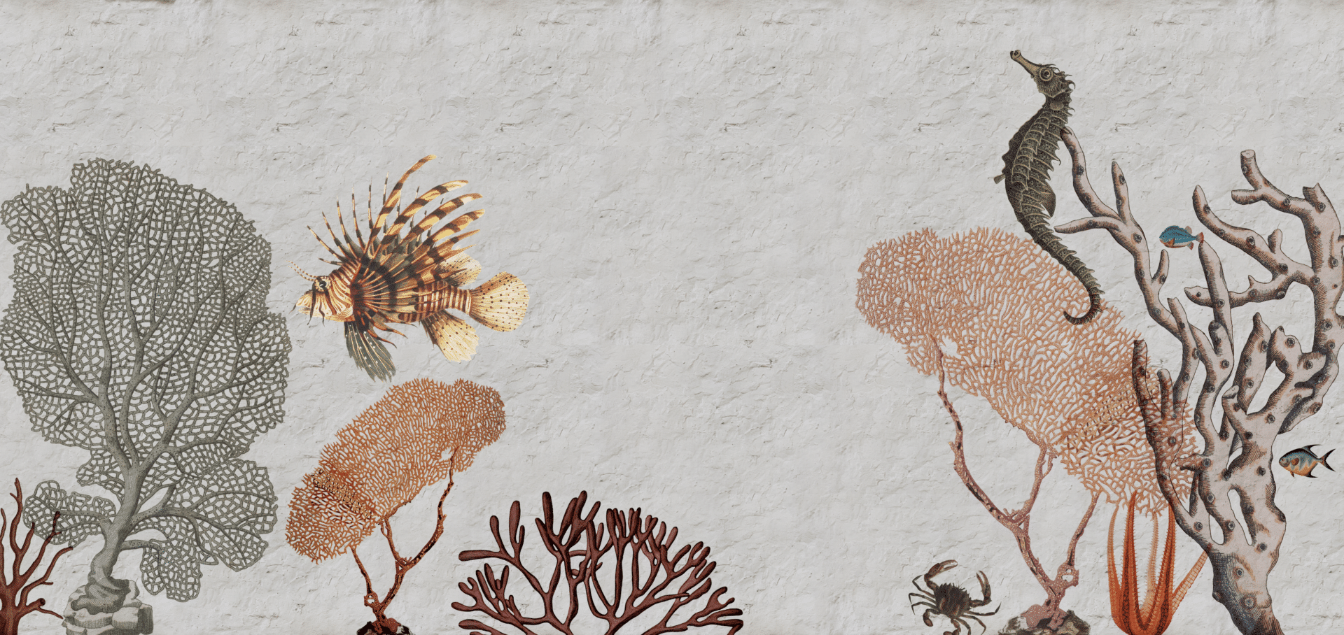 Die Farbwelt: gedämpfte Naturtöne, von Sand über Terrakotta bis hin zu Meeresgrün – vereinzelt durchzogen von tiefem Blau, Goldgelb und warmem Kupfer. Ideal für Spa-Bereiche, Kinderzimmer mit maritimer Leichtigkeit oder Wohnräume mit einer Vorliebe für das Besondere.