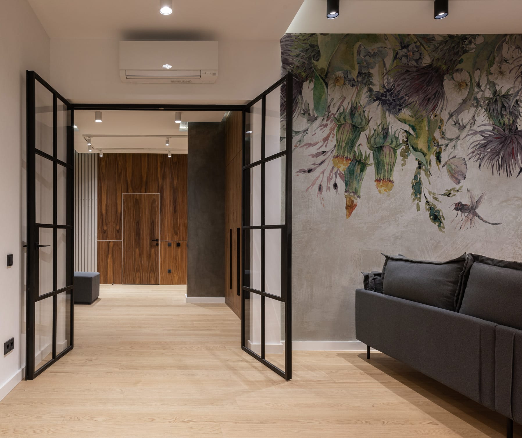 Die reduzierte Farbgebung wirkt wie eine Radierung oder ein Kupferstich, zeitlos und gleichzeitig modern. Es ist ein Wandbild, das nicht laut wird, sondern in seiner stillen Präsenz Räume erdet – mit Tiefe, Struktur und Naturgewalt.