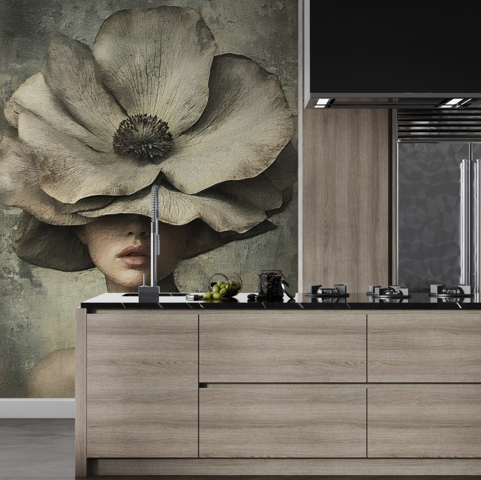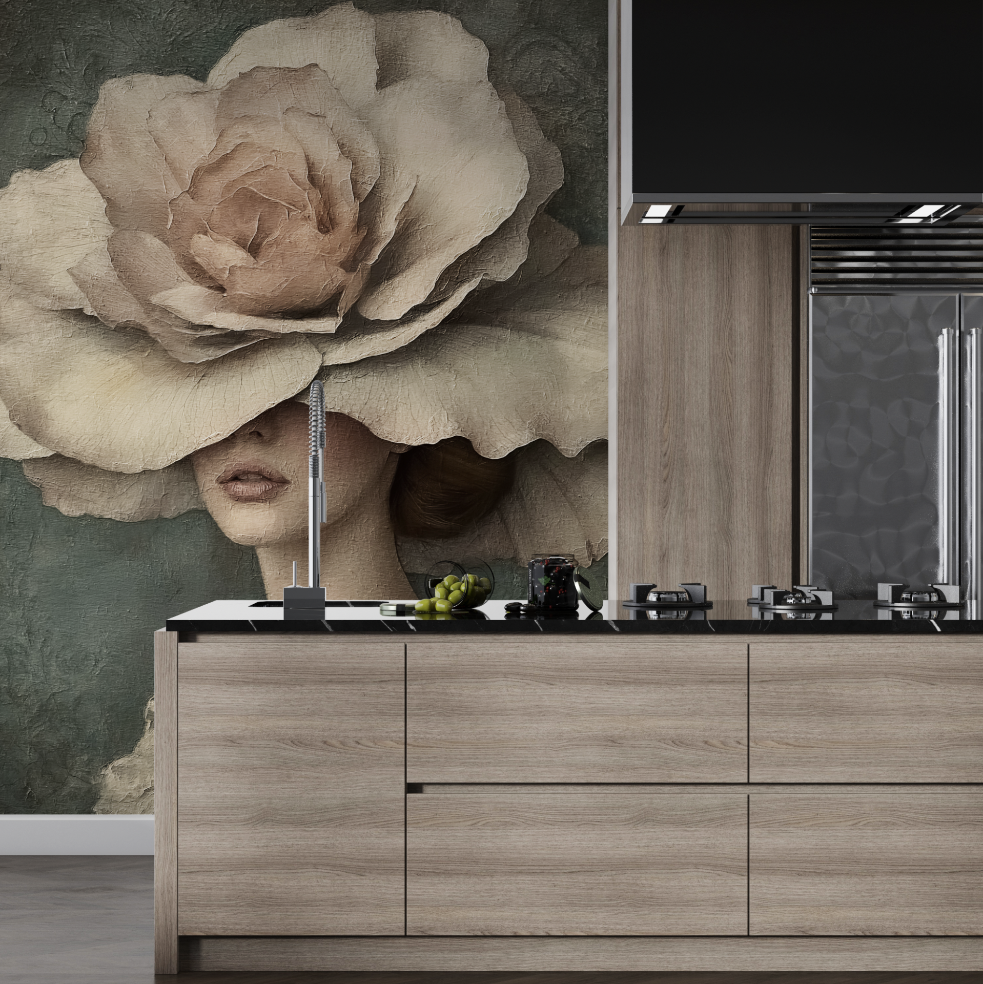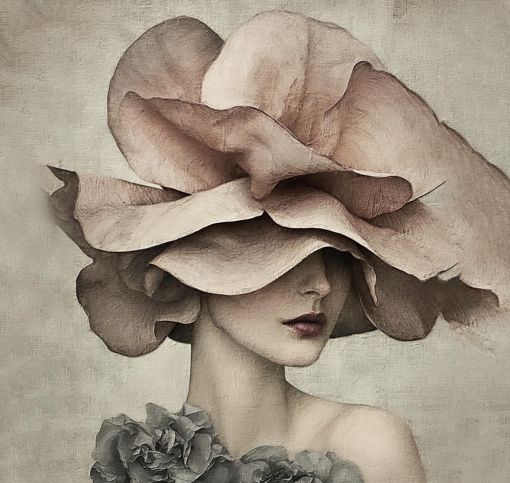 In „Velvet Blossom“ verschmilzt die Schönheit der Natur mit der Anmut des Weiblichen zu einem poetischen Porträt. Eine Frau, halb verborgen unter einer überdimensionalen, samtig wirkenden Blüte, blickt in Andeutung. Die Blätter ihres „Hutes“ fallen wie weich gefalteter Stoff, voll zarter Spannung – ein Symbol für Wandel, Weiblichkeit und stille Kraft.