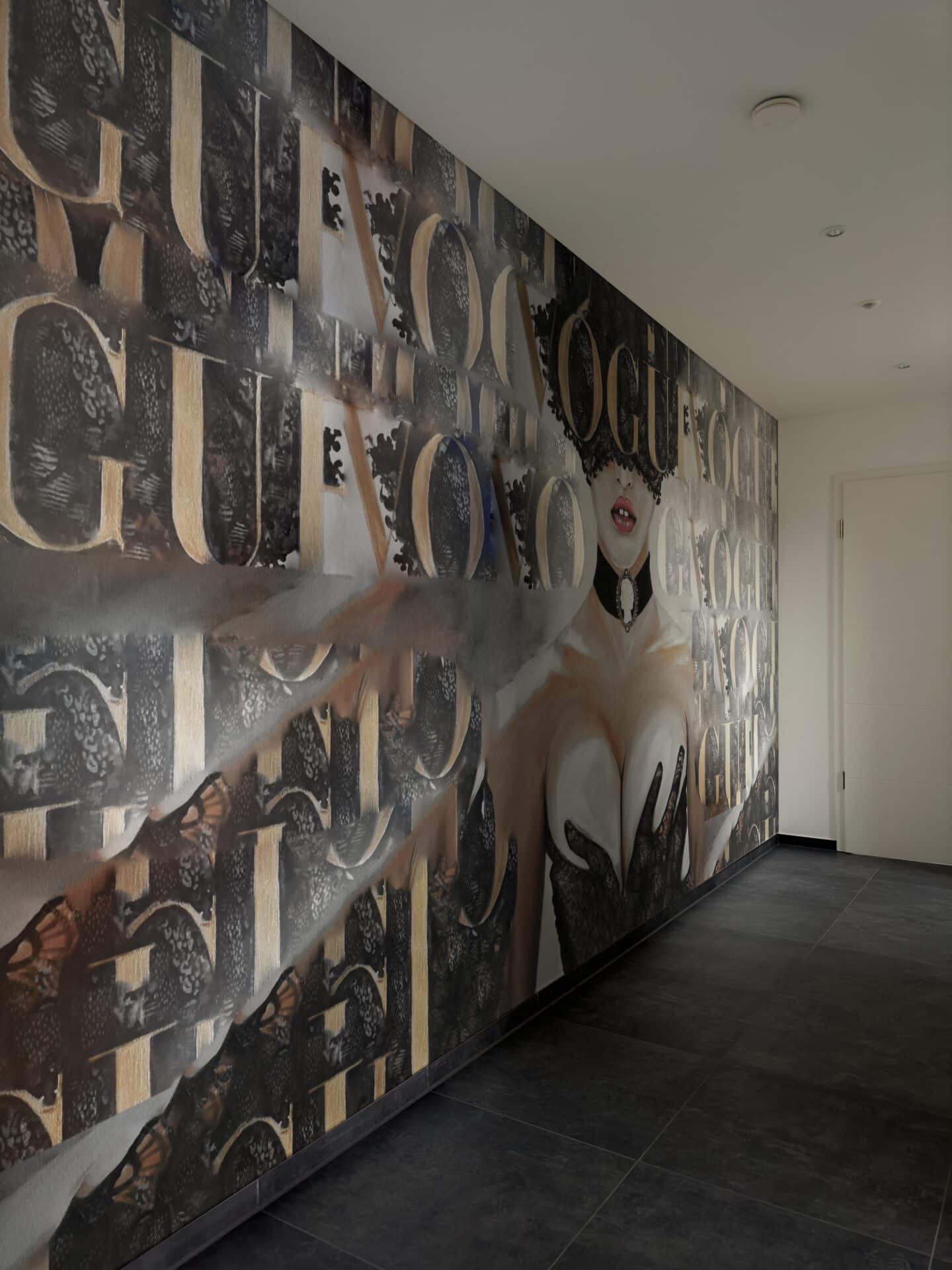 „Vogue“ ist kein stilles Bild – es ist ein Statement. Sinnlich, mutig, inszeniert wie ein Cover. Die Figur – selbstbewusst, geheimnisvoll, unter der Spitzenmaske verborgen – verkörpert pure Weiblichkeit zwischen Luxus und Inszenierung. Hände in schwarzem Samt, Lippen in aufregendem Rot. Dahinter: der goldene Schriftzug, dominant, ikonisch, wiederholt sich wie ein Mantra – Mode, Macht, Mythos.