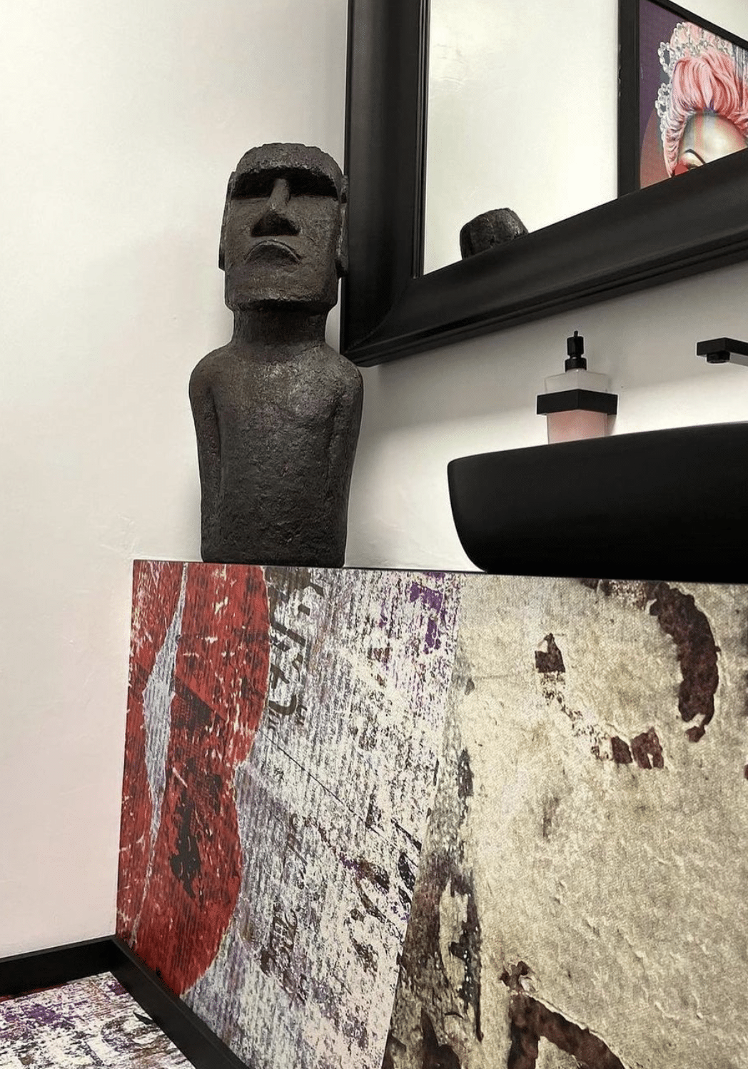 Das Highlight dieses Raumes ist aber nicht nur der Boden, sondern auch der mit unserem Motiv bezogene Untertisch des Waschbeckens.
