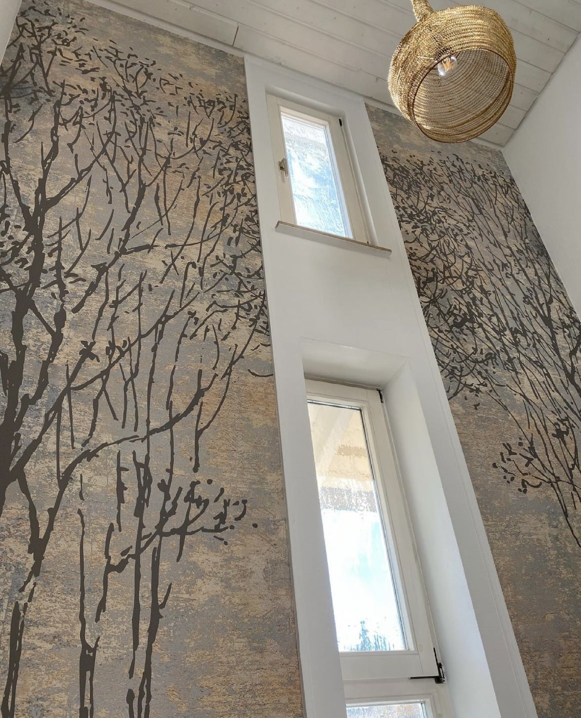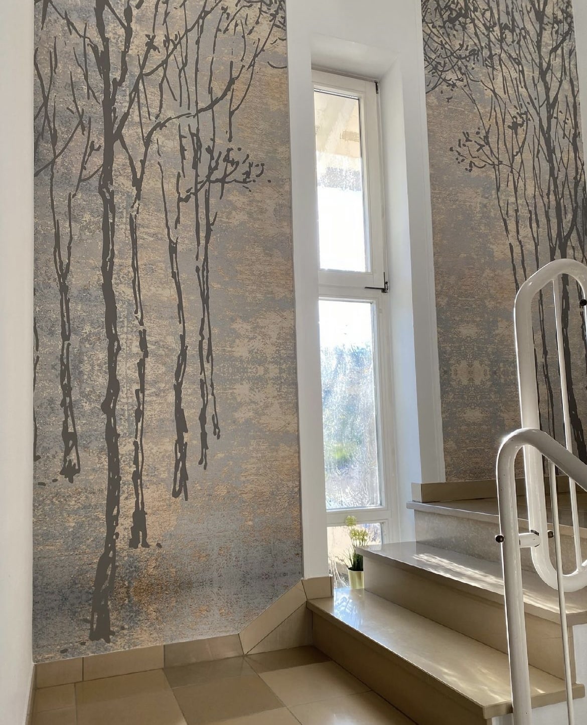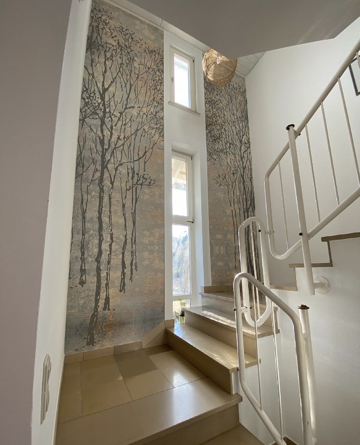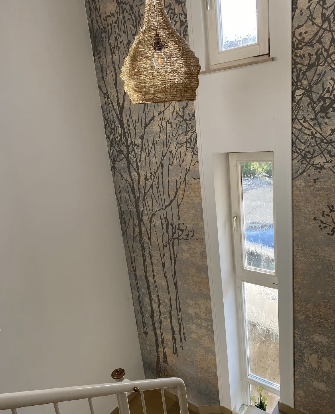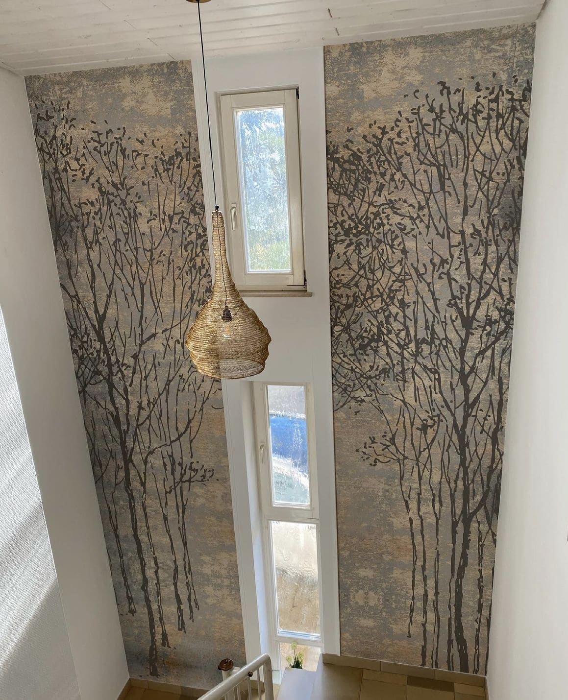 Wir konnten mit nur zwei Bahnen diesem Treppenhaus einen neuen Look verpassen. Vorher war es tatsächlich in einem sehr dunklen Blauton gestrichen.